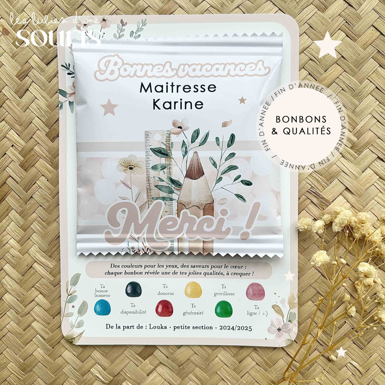 Chaque bonbon représente une qualité ou une valeur importante — douceur, patience, bienveillance, créativité… — autant de petites attentions qui rendent leur travail si précieux. Offrir ce sachet, c’est offrir un symbole sucré et personnalisé de gratitude, accompagné d’un moment de pause et de plaisir.