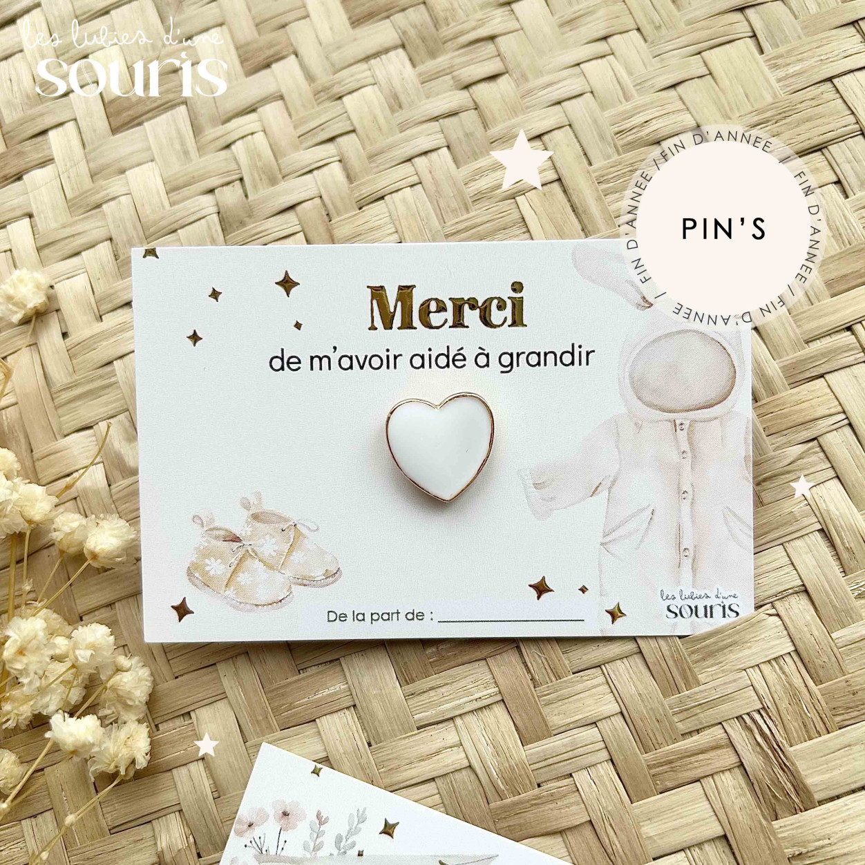Un message doux et symbolique, mis en valeur par une dorure délicate et accompagné d’un pin’s en forme de cœur – blanc avec un fin contour doré – à détacher et porter fièrement.