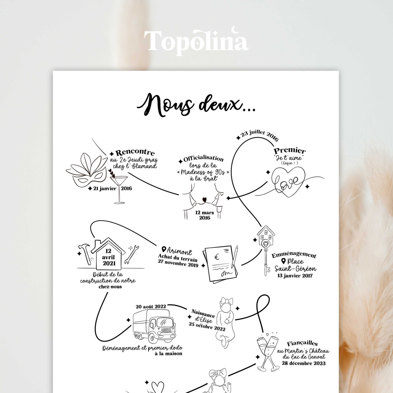 L’affiche “Notre Histoire” retrace les grandes étapes de votre vie : rencontre, projets, mariage, naissance des enfants ou nouvelle maison. Chaque détail est illustré avec soin et fait main, pour un souvenir unique et intemporel.