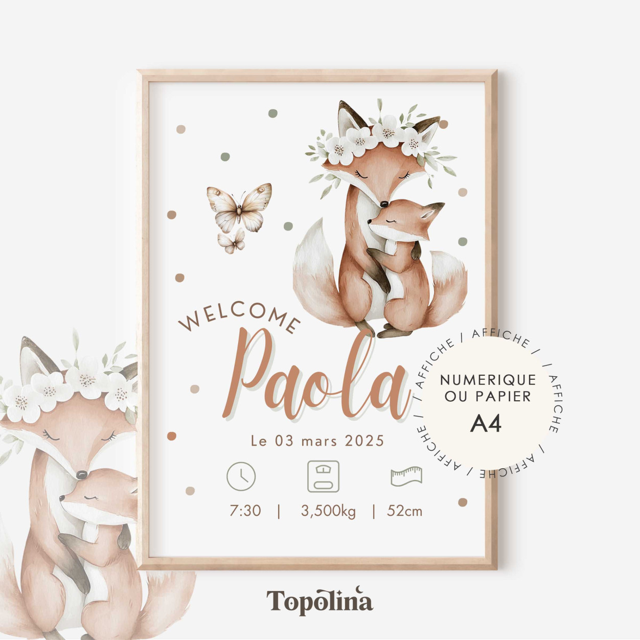 Cette affiche naissance met en scène une maman renarde et son bébé, dans une illustration douce et réconfortante.