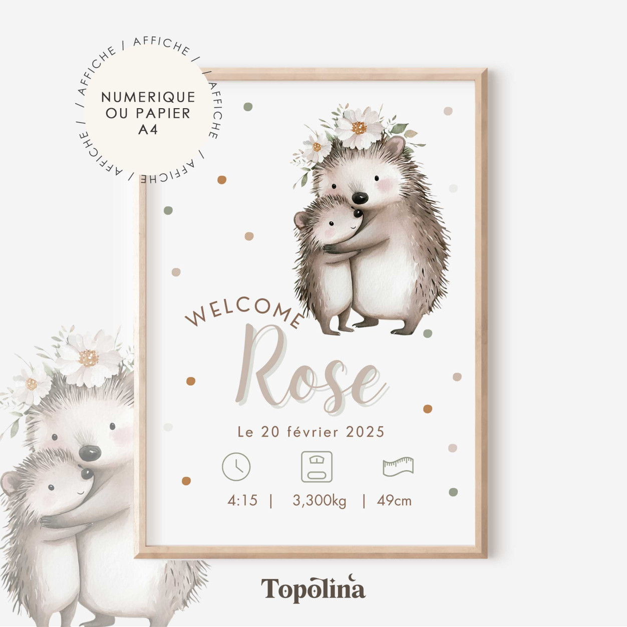 Cette affiche naissance met en scène une maman hérisson et son bébé, dans une illustration douce et réconfortante.
