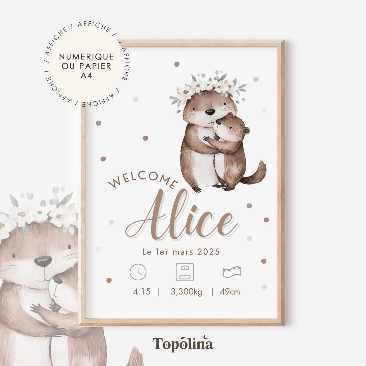 Cette affiche naissance met en scène une maman castor et son bébé, dans une illustration douce et réconfortante.