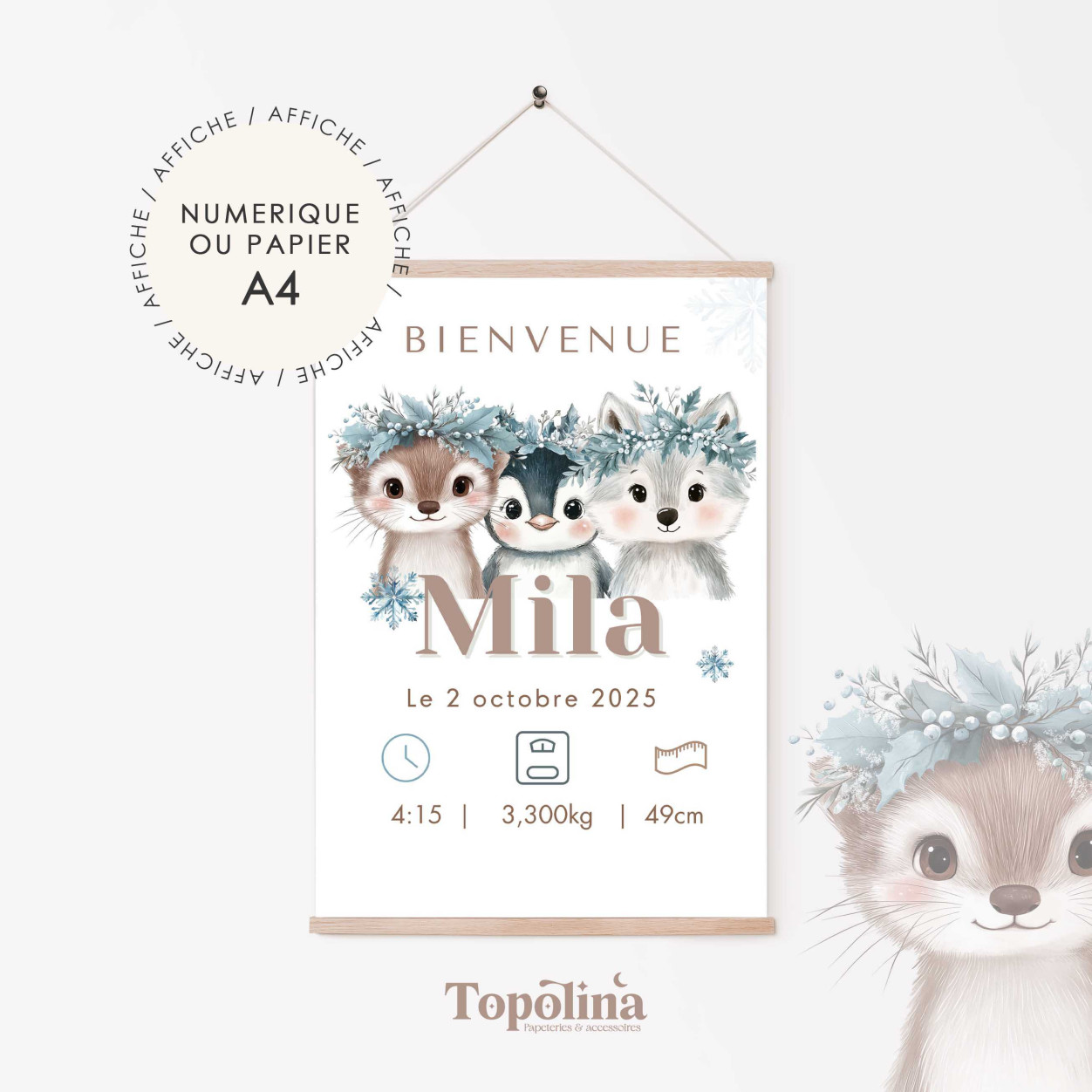 Cette affiche de naissance thème hiver met à l’honneur trois animaux emblématiques : la loutre, le loup et le pingouin.