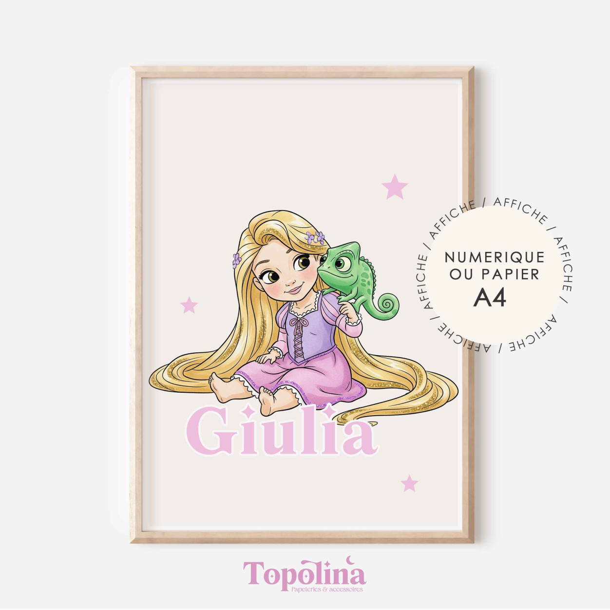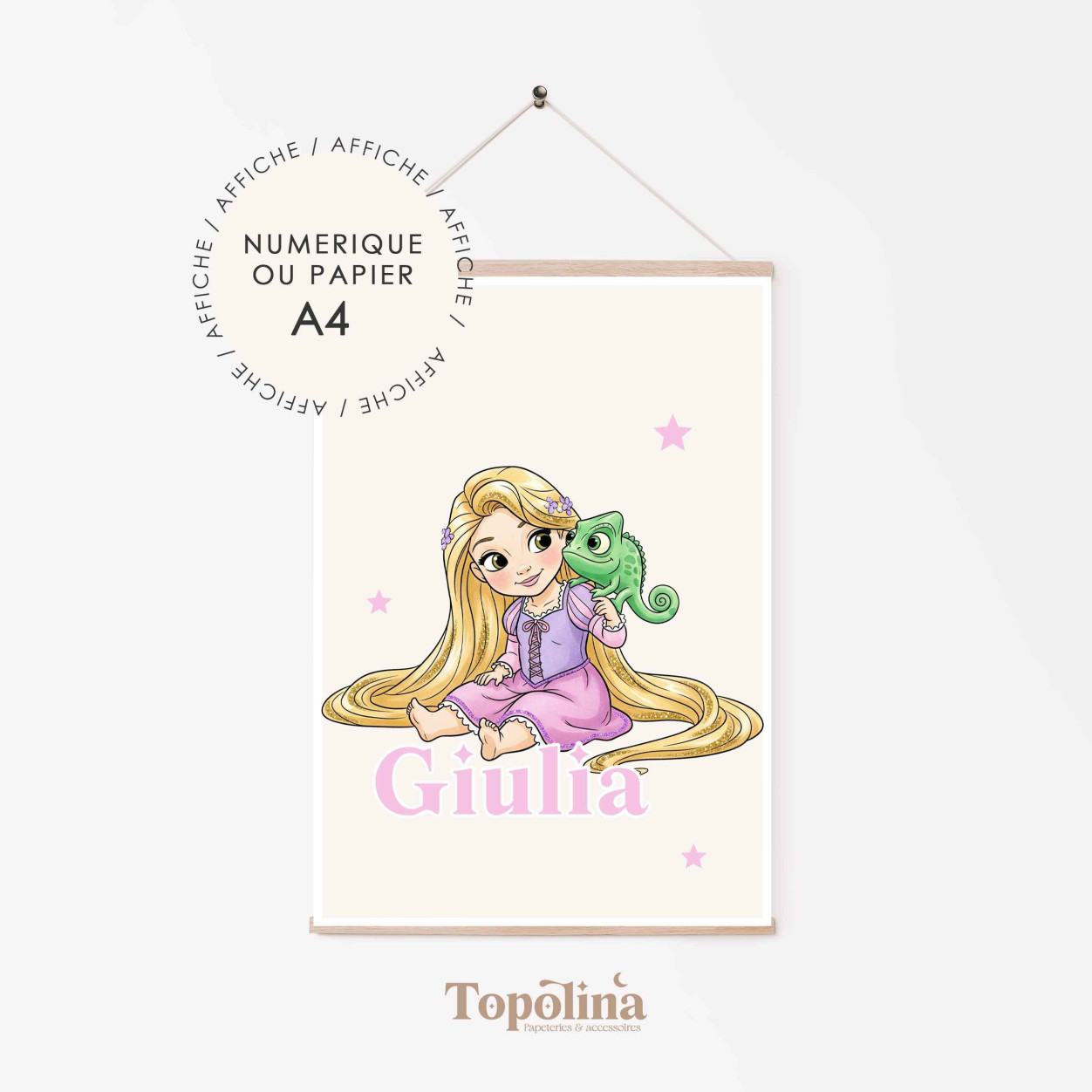 Pensée pour créer un univers tendre et magique, cette affiche combine la féerie de Raiponce à la personnalisation du prénom, pour une décoration unique et pleine de charme.