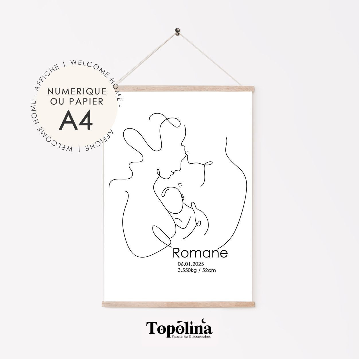 Cette affiche émotive capture le lien unique. Avec une illustration douce et pleine de tendresse, elle représente de jeunes parents entourant leur enfant, un moment symbolique de protection et d’amour. Chaque affiche est personnalisée avec le prénom et les elements de naissance de l'enfant, transformant ainsi ce cadeau en un souvenir précieux, ancré dans le temps. Parfaite pour célébrer une naissance, un anniversaire, ou simplement immortaliser un moment spécial, cette affiche ajoute une touche personnelle et émotive à n'importe quelle pièce.