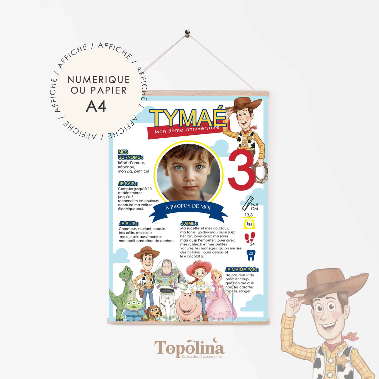 Offrez un souvenir unique et plein de couleurs avec notre affiche personnalisée sur le thème Toy Story. Parfaite pour un anniversaire, un baptême ou une fête d’enfant, cette affiche féerique transforme votre événement en un moment inoubliable. Inspirée de l’univers Toy Story, elle mêle personnages emblématiques, couleurs vives et ambiance joyeuse pour émerveiller petits et grands.