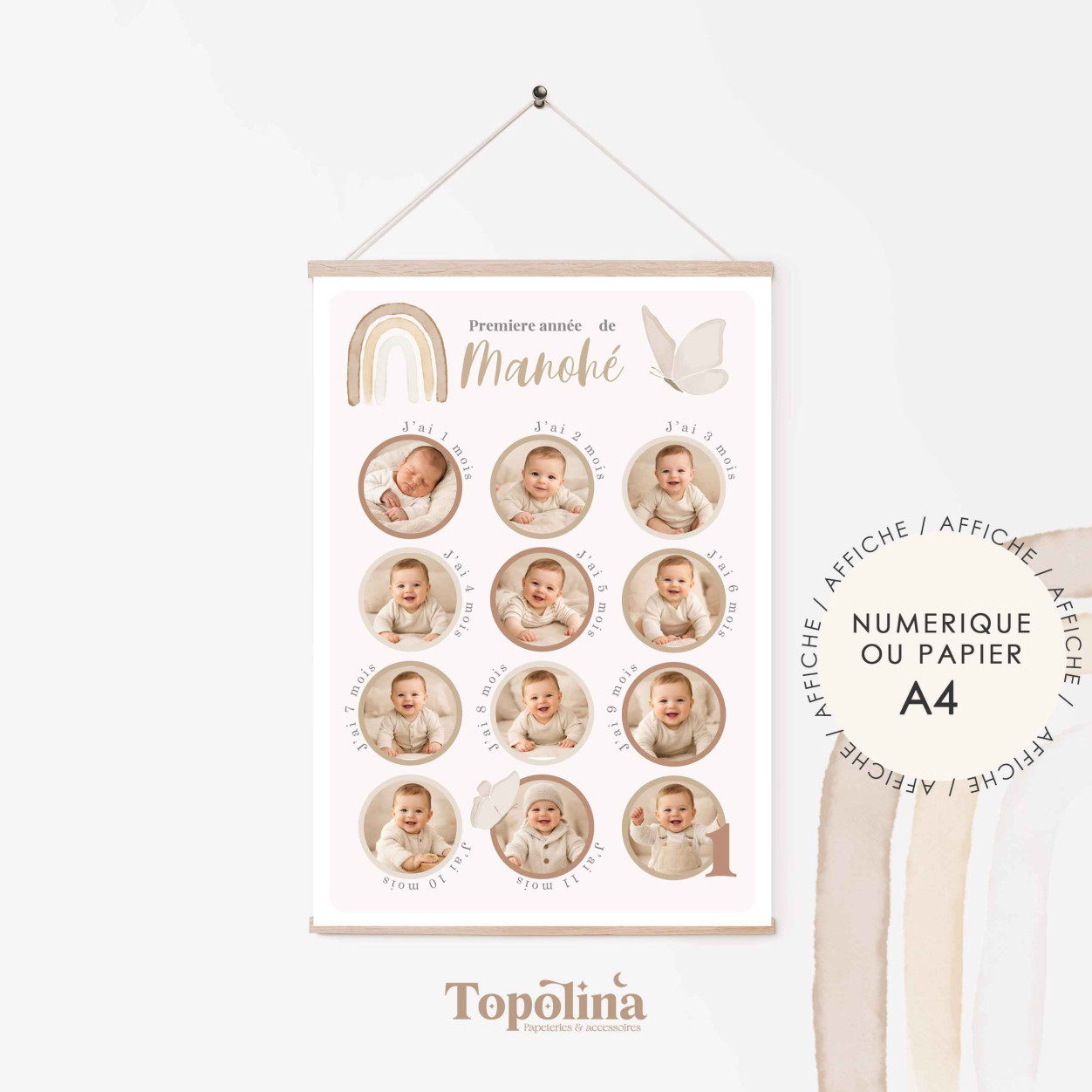 Cette affiche personnalisée “Première année” permet de rassembler 12 photos, une pour chaque mois, afin de voir grandir votre enfant en un seul regard.