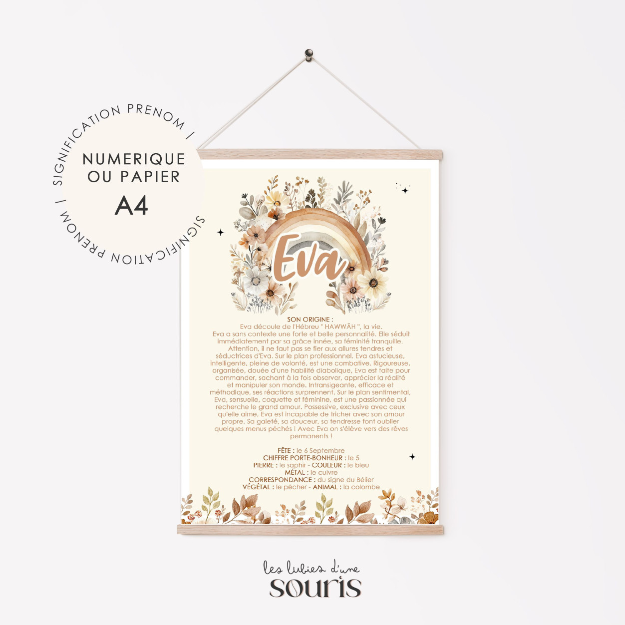 Affiche signification du prénom, le caractère ainsi que la fête correspondante au prénom choisi.