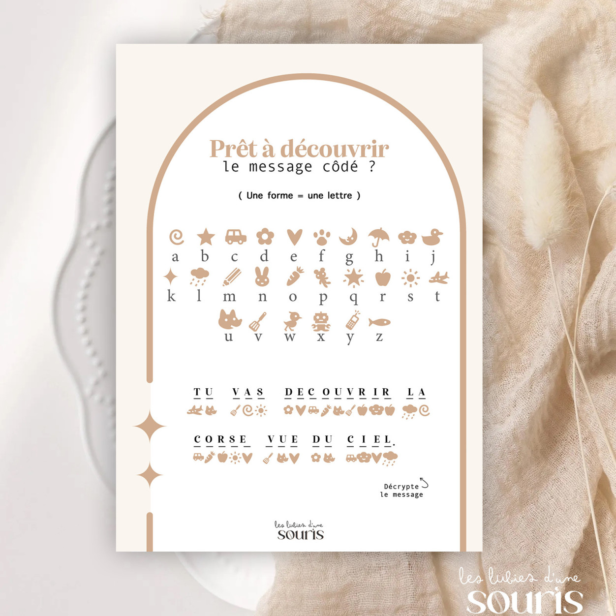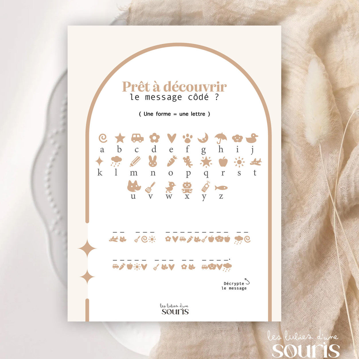 Un véritable trésor de créativité, cette carte révèle une surprise qui se dévoilera au fil des lettres et des symboles. Son design ludique invite au jeu de la découverte : des cœurs, des fleurs, et des emblèmes variés, tels une couronne et une étoile, s'entremêlent avec une typographie amusante pour créer un message codé que vos destinataires auront le plaisir de déchiffrer.
