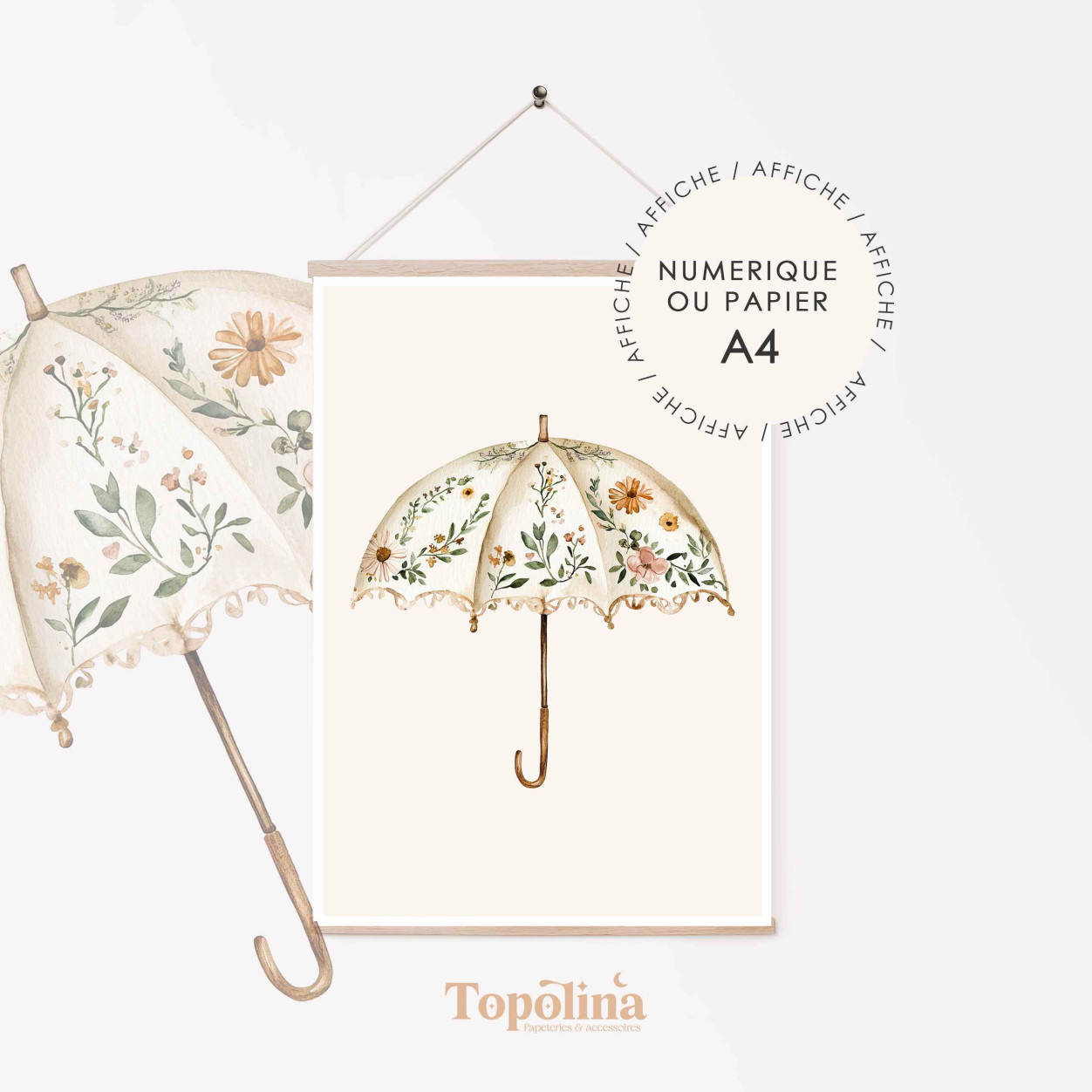 Cette affiche met en scène un joli parapluie entouré de fleurs délicates, dans une ambiance douce et poétique.