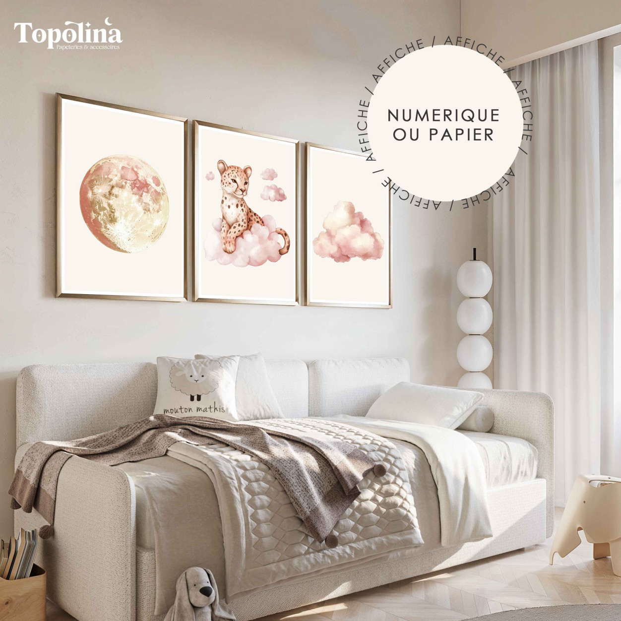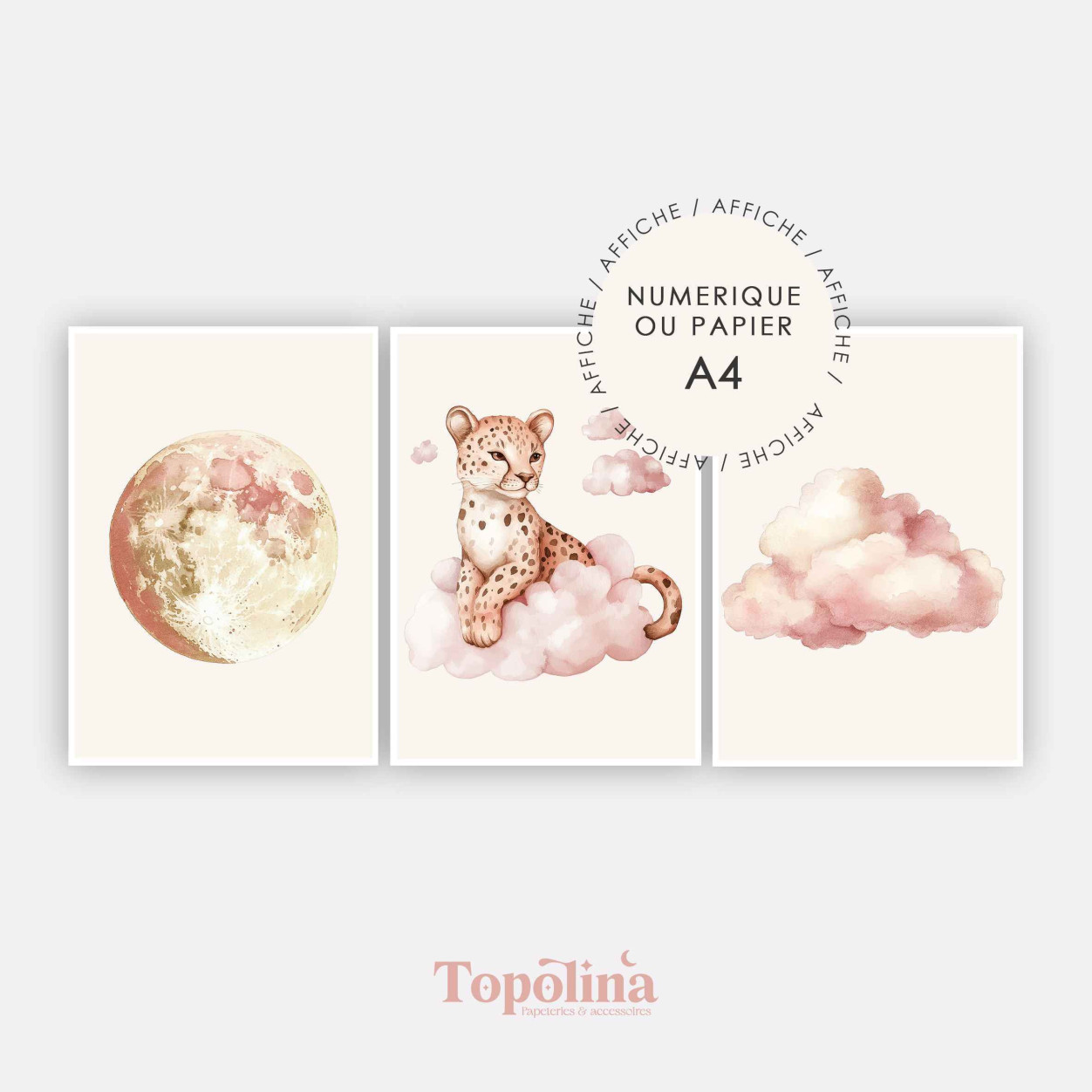 Décorez la chambre de votre enfant avec ce trio d’affiches girly combinant lune, nuage et léopard. Ces illustrations délicates apportent douceur, charme et modernité à tout mur, pour créer un univers tendre et poétique.