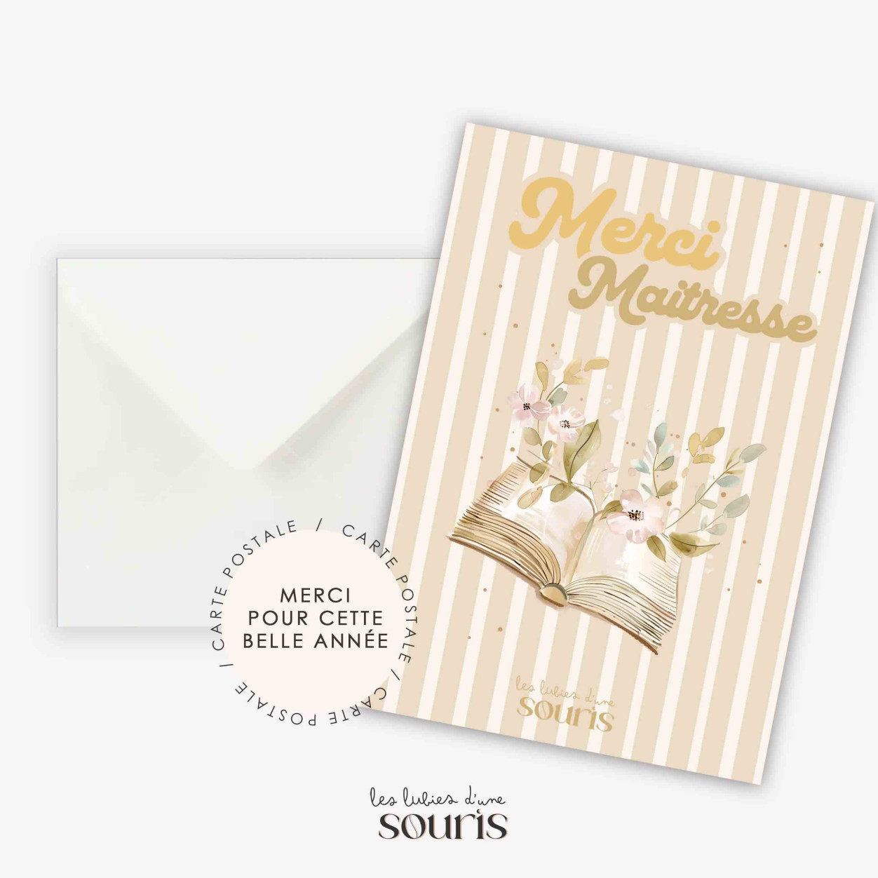 Parfaite pour accompagner un cadeau ou simplement transmettre un mot du cœur, cette carte postale “Merci Maîtresse”est une attention délicate pour marquer la fin de l’année scolaire.