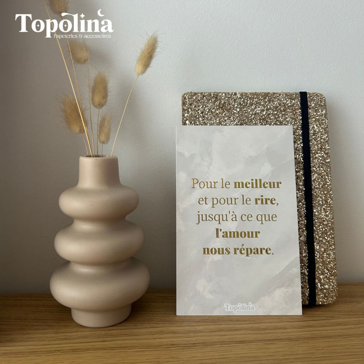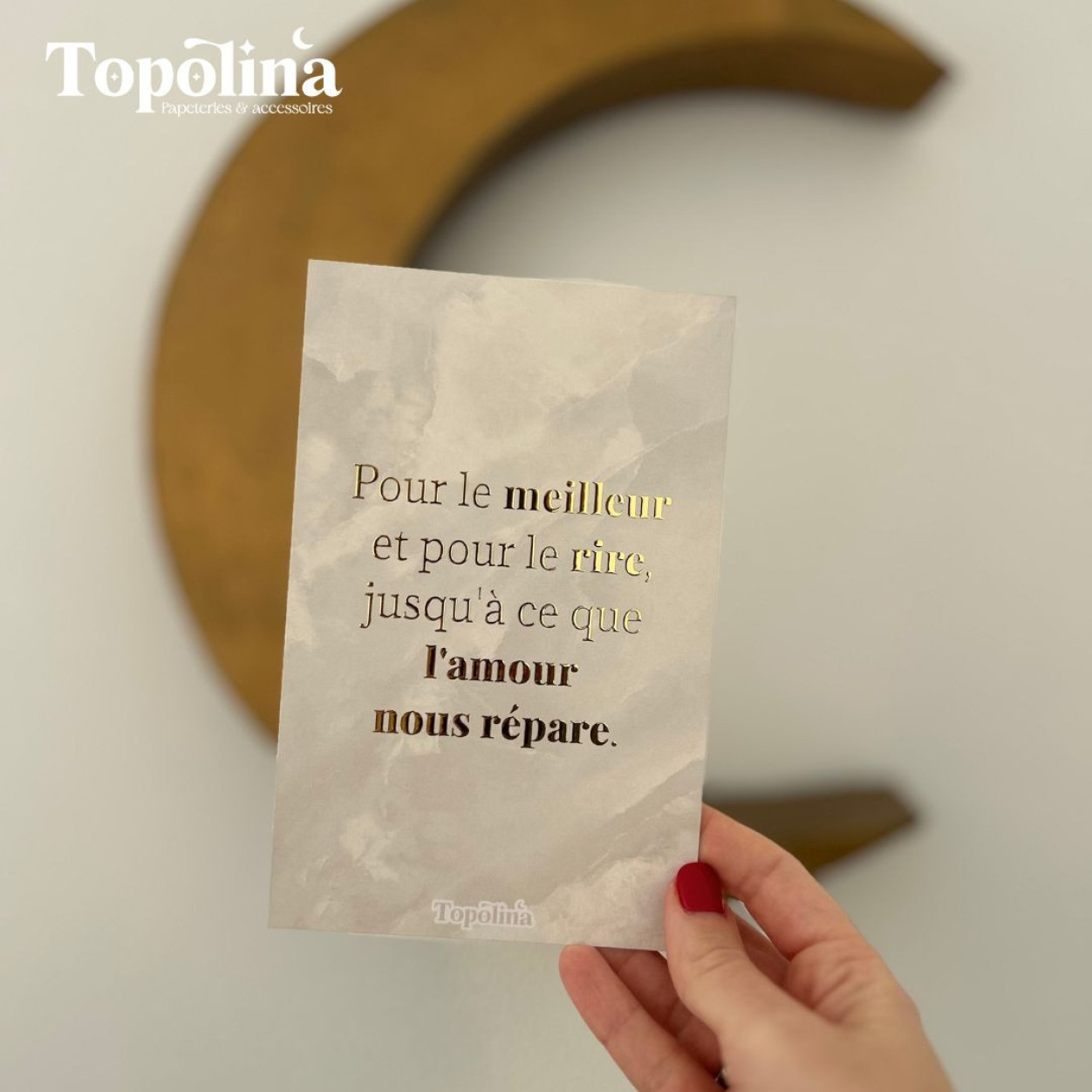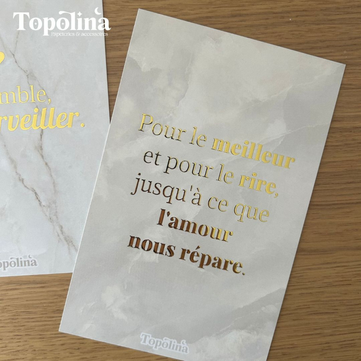Célébrez l’amour vrai, celui qui traverse les tempêtes et illumine les jours heureux, avec cette carte citation en dorure à chaud.