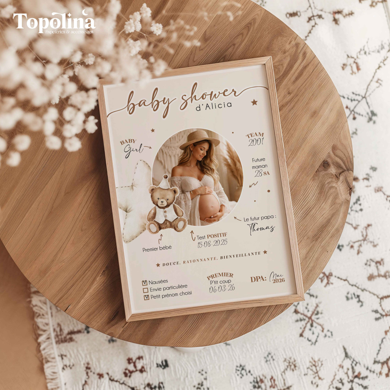 Au centre de l’affiche, sa photo met en lumière ce moment unique, entourée d’informations douces et symboliques sur elle, sa grossesse et cette belle aventure qui commence.