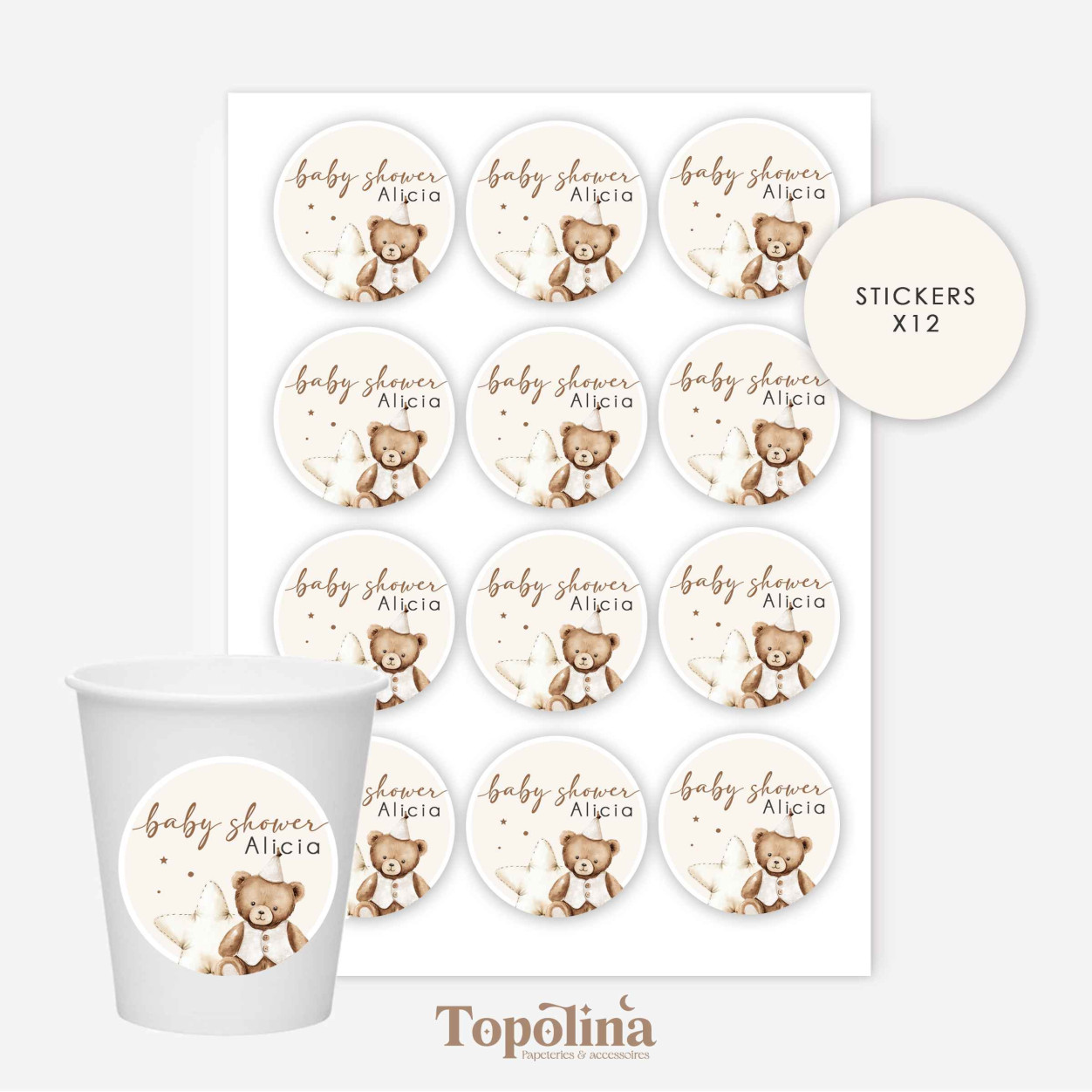 Apportez une touche de tendresse et de douceur à votre décoration de fête avec ces stickers à coller sur des gobelets, illustrés d’un adorable ourson dans des tons doux et chaleureux.