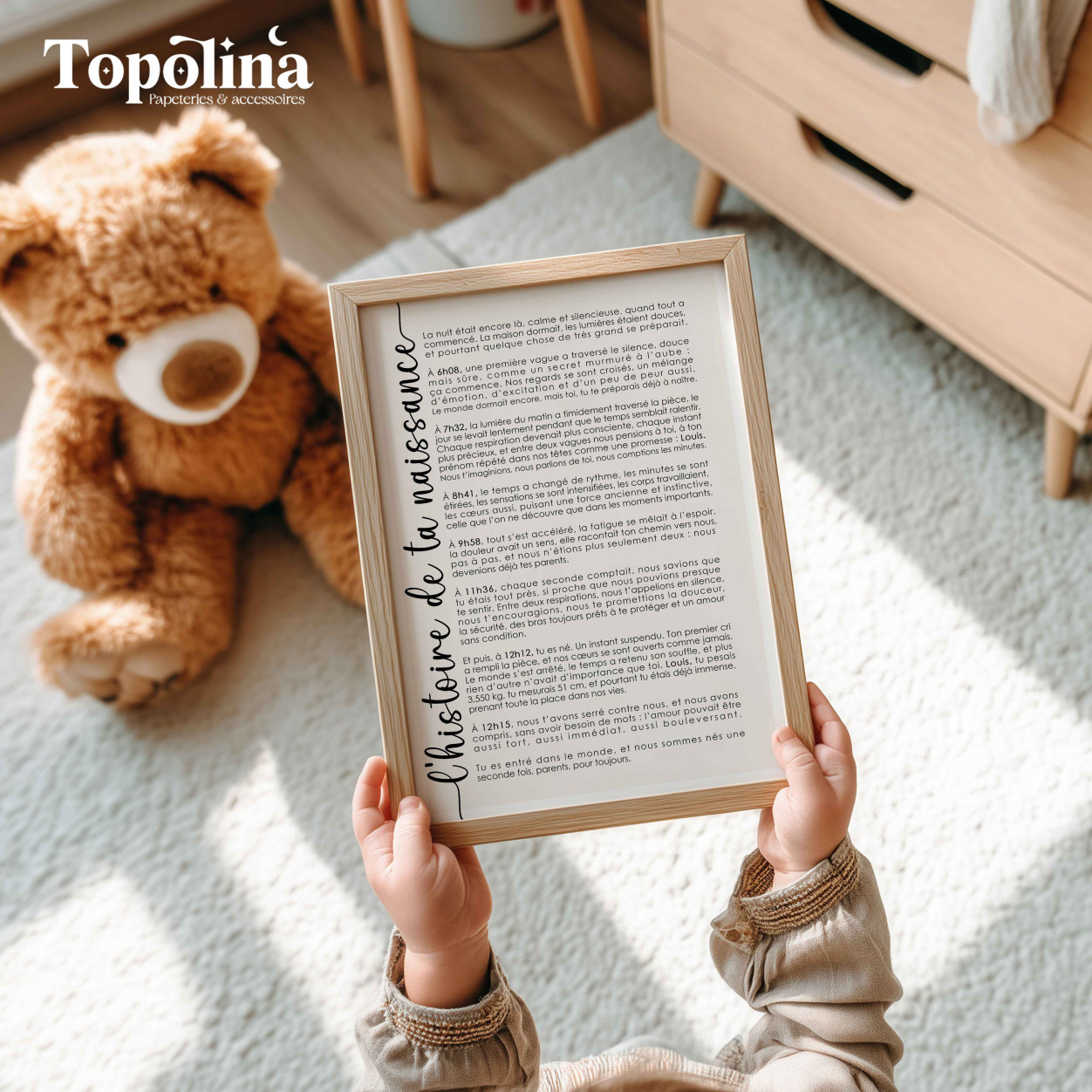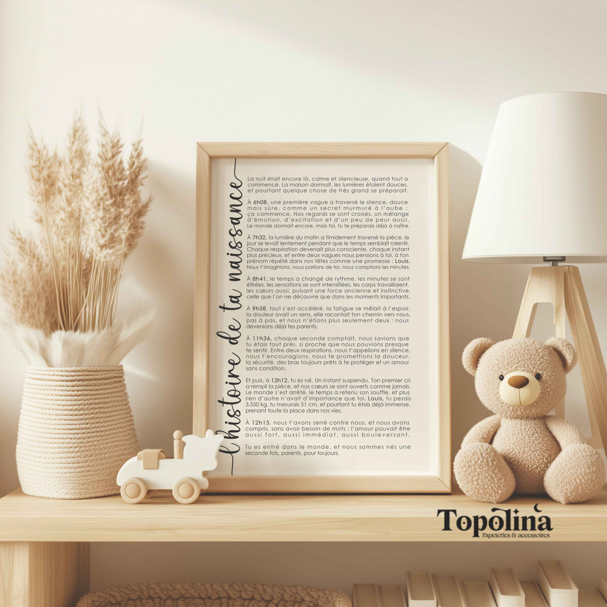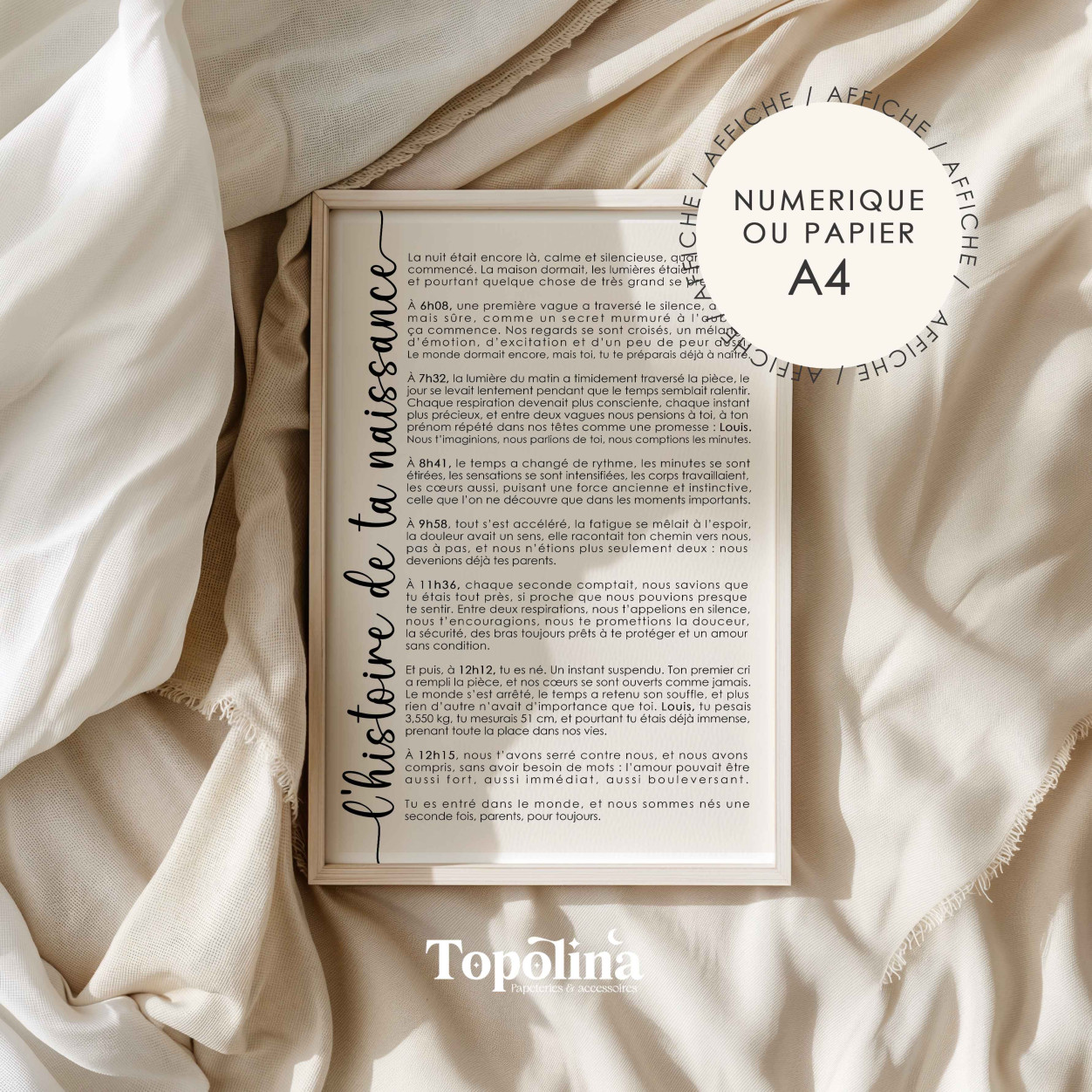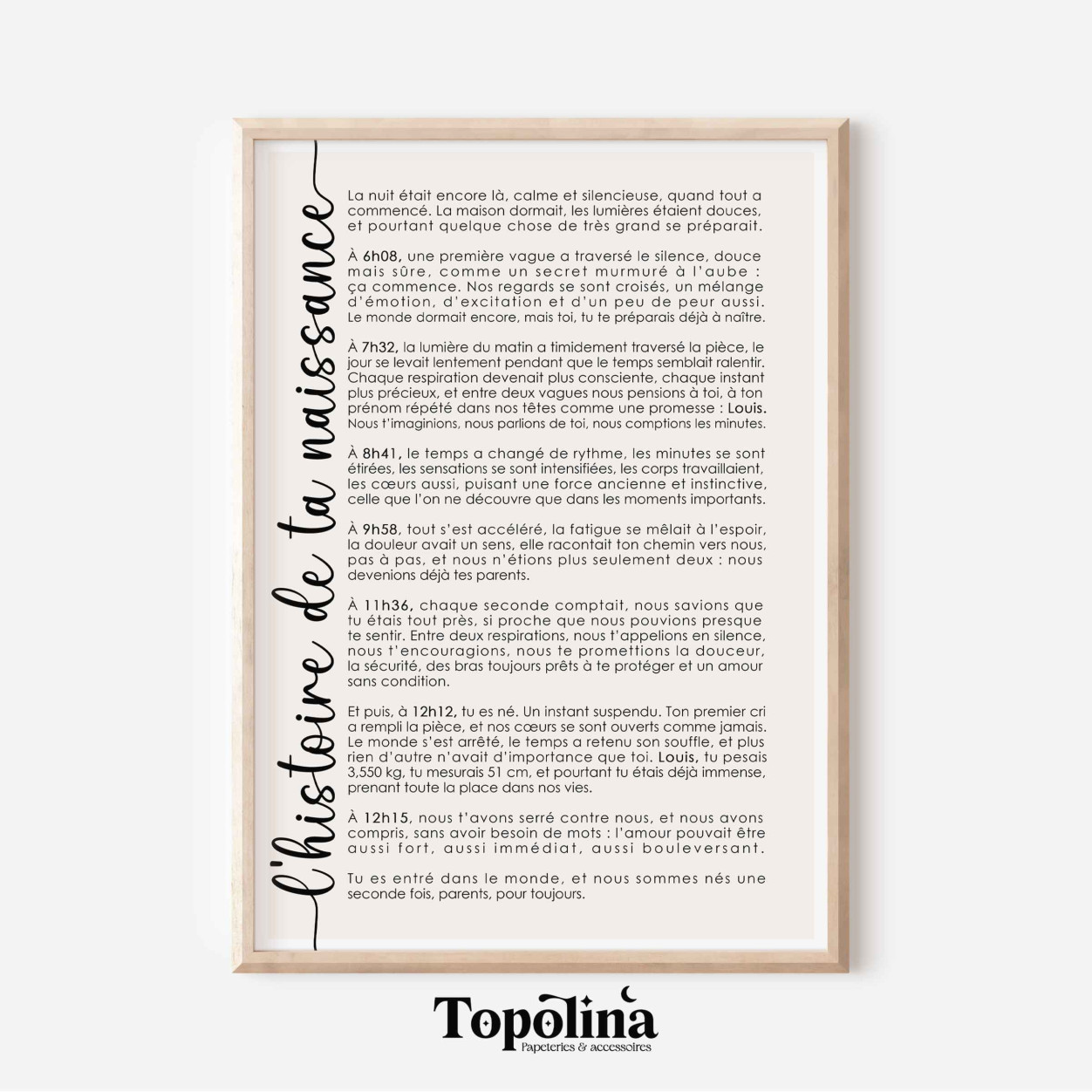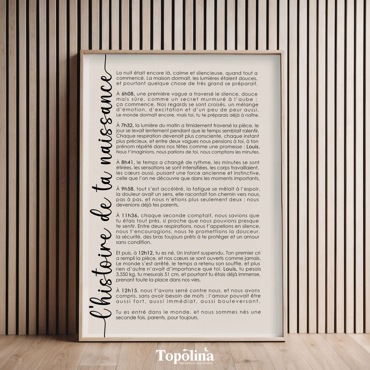 Le titre de l'affiche (Ex: L'histoire de ta naissance) et le texte, avec ou sans horaires, la date, début du travail, moments marquants (arrivée à la maternité, première contraction, poussée…), l’instant de la rencontre avec bébé, prénom de l’enfant... ( l'adresse email : bonjour@topolina.fr)