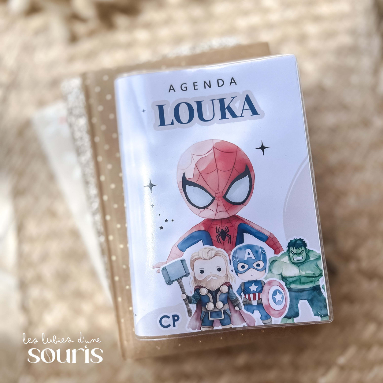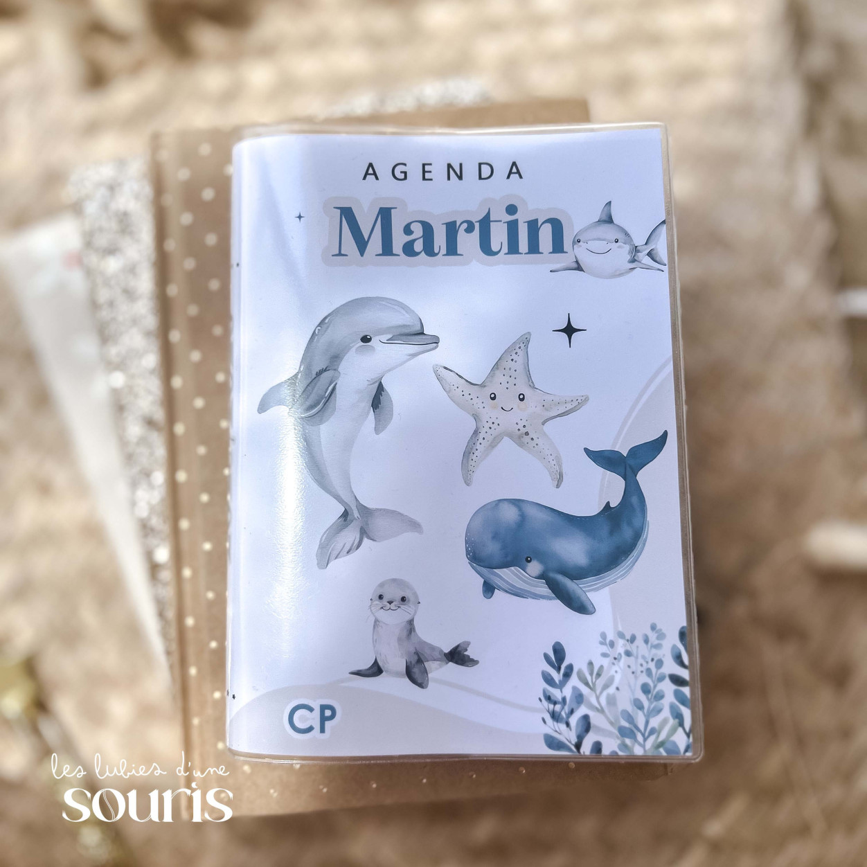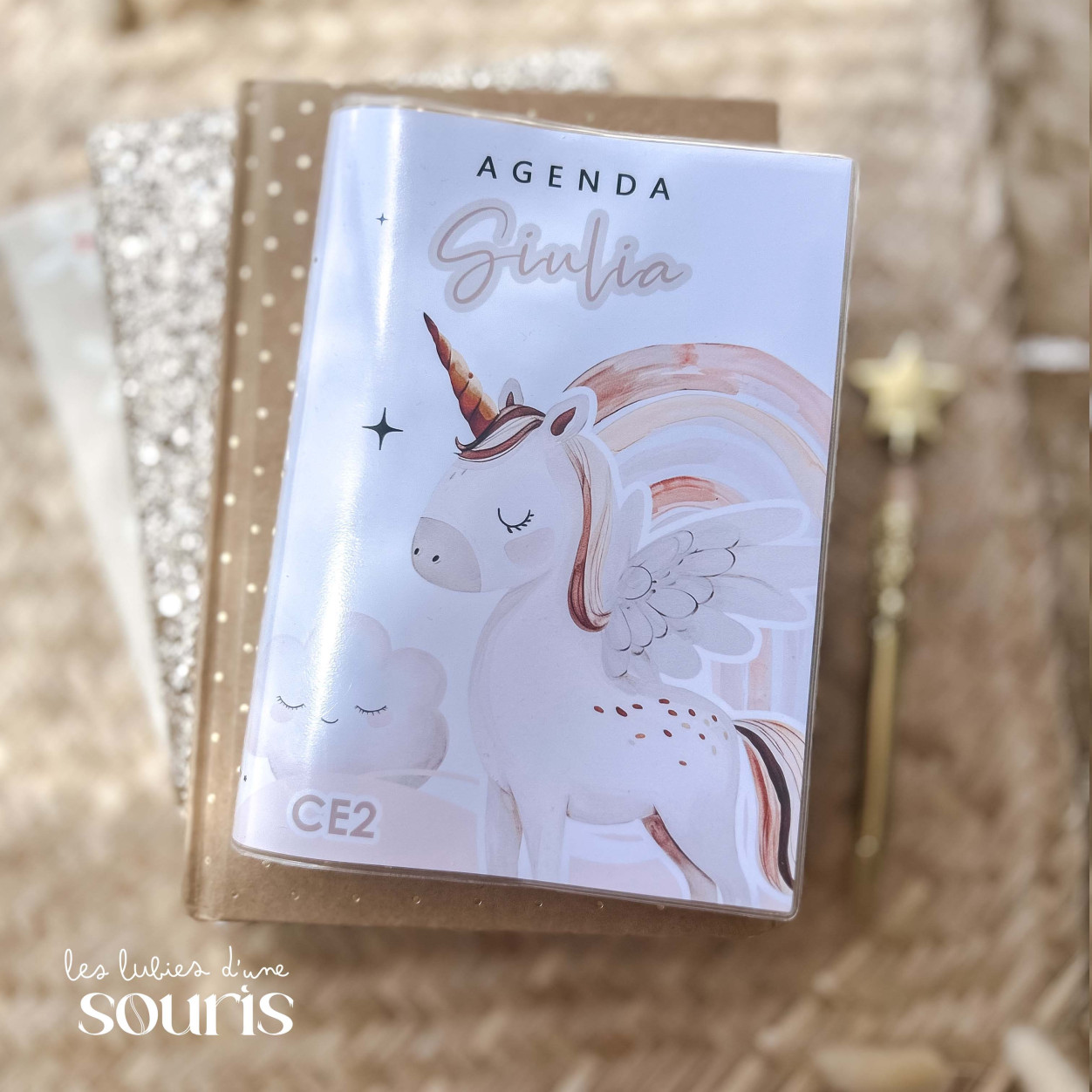 Couverture entièrement personnalisable : prénom, classe, couleurs, illustrations, motifs… Le thème est au choix : animaux, arc-en-ciel, dinosaures, univers féérique, sport, espace… ou tout autre univers qui ressemble à votre enfant.