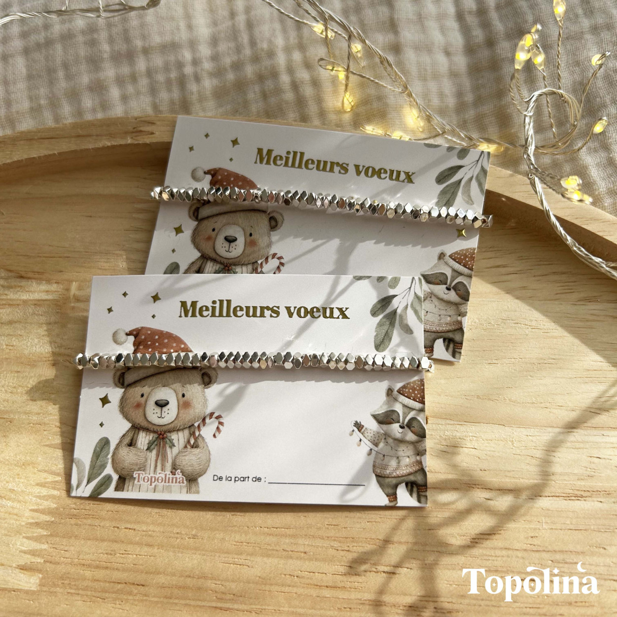 Offrez une attention douce et pleine de magie avec la carte “Meilleurs Vœux”, sublimée d’une dorure lumineuse et accompagnée d’un bracelet en perles argentées.