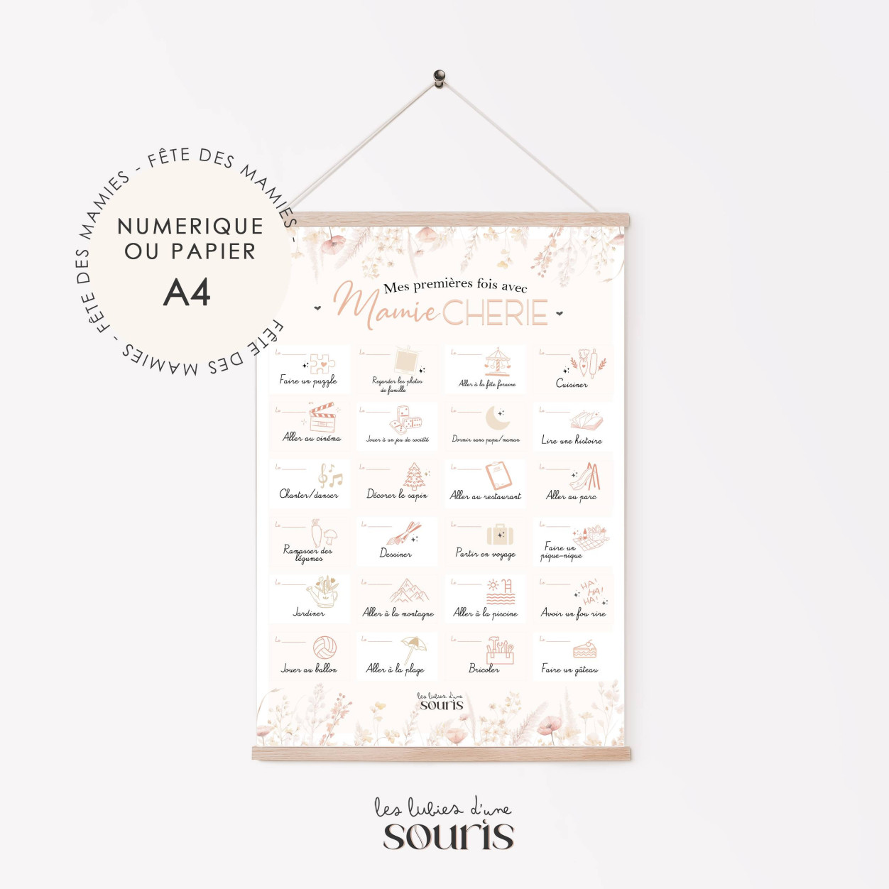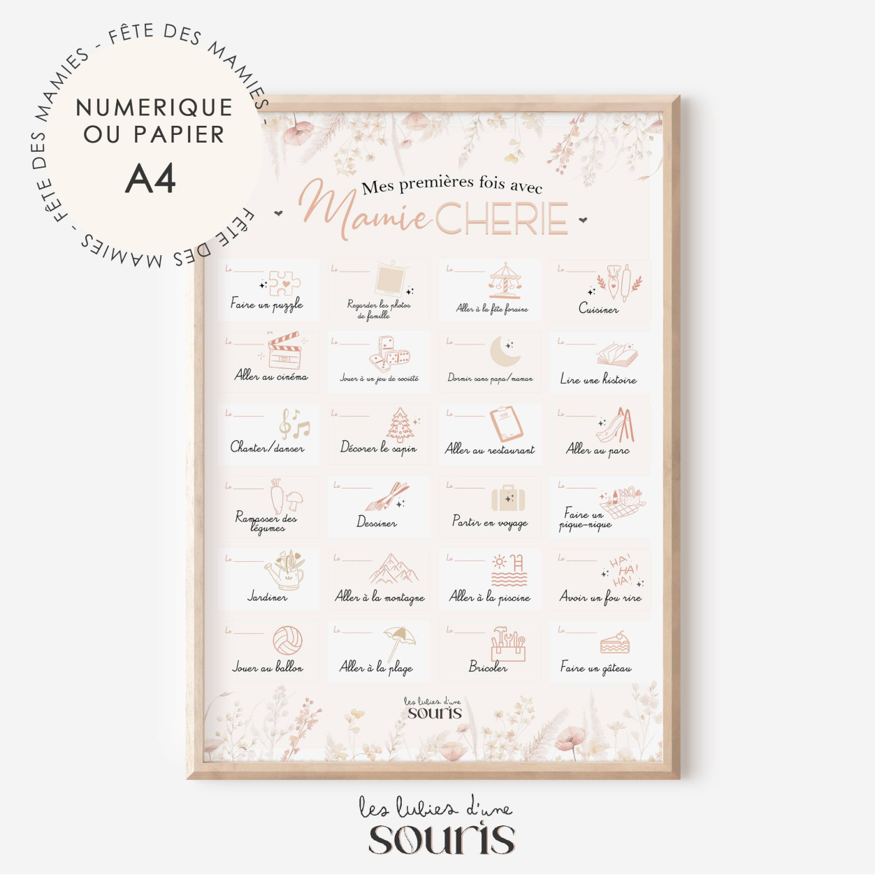 Notez les premières fois, les petites dates qui marquent l'évolution de leur relation exceptionnelle. De la première balade main dans la main au premier gâteau ensemble, cette affiche devient le tableau vivant de leurs moments précieux. Une ode à l'amour grandissant entre petits-enfants et Mamie chérie.
