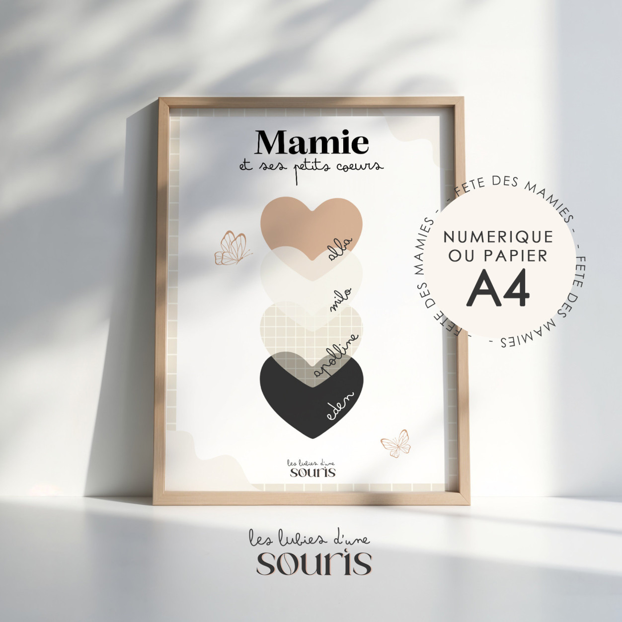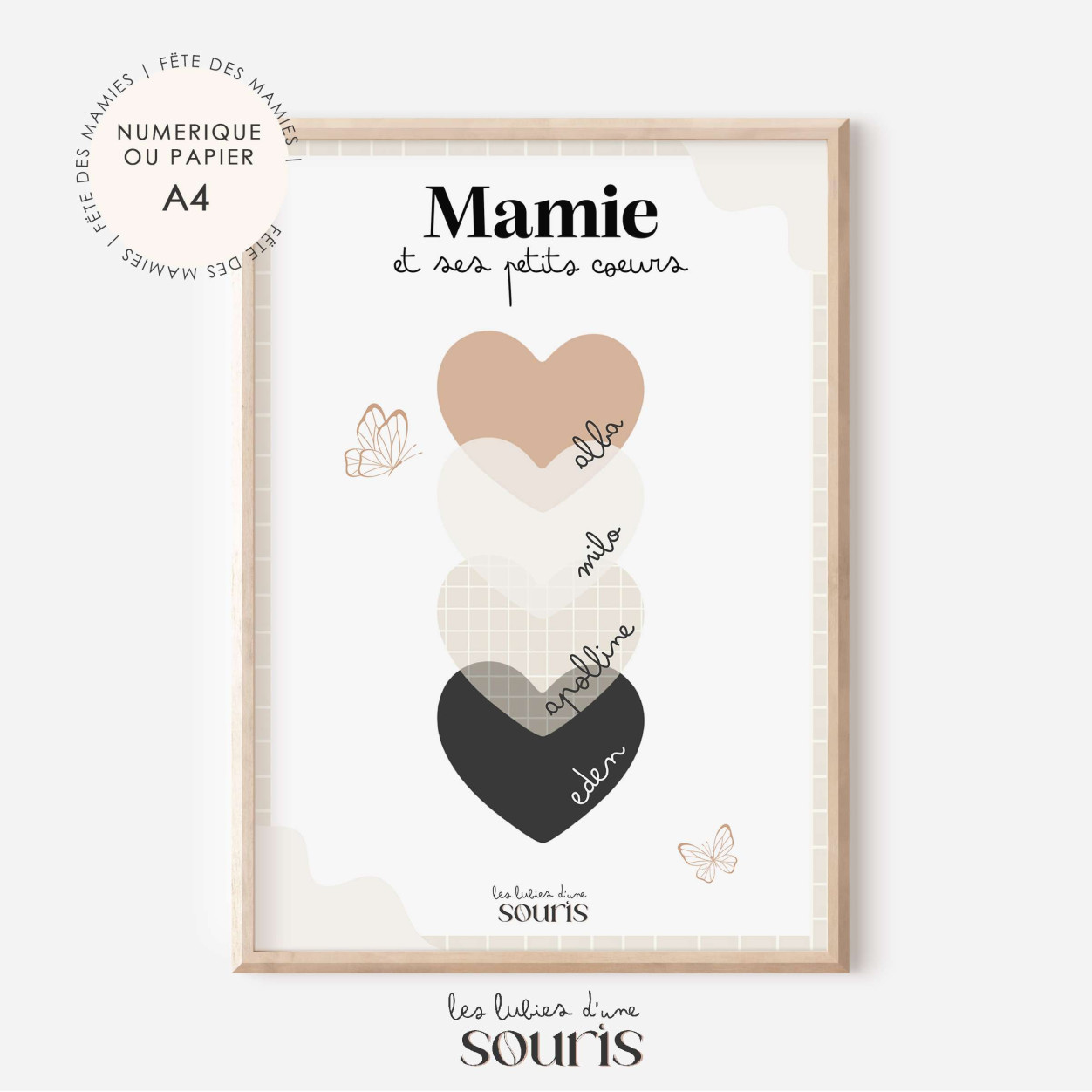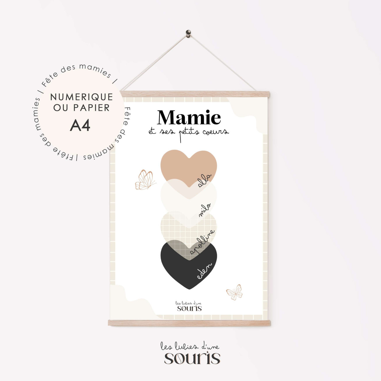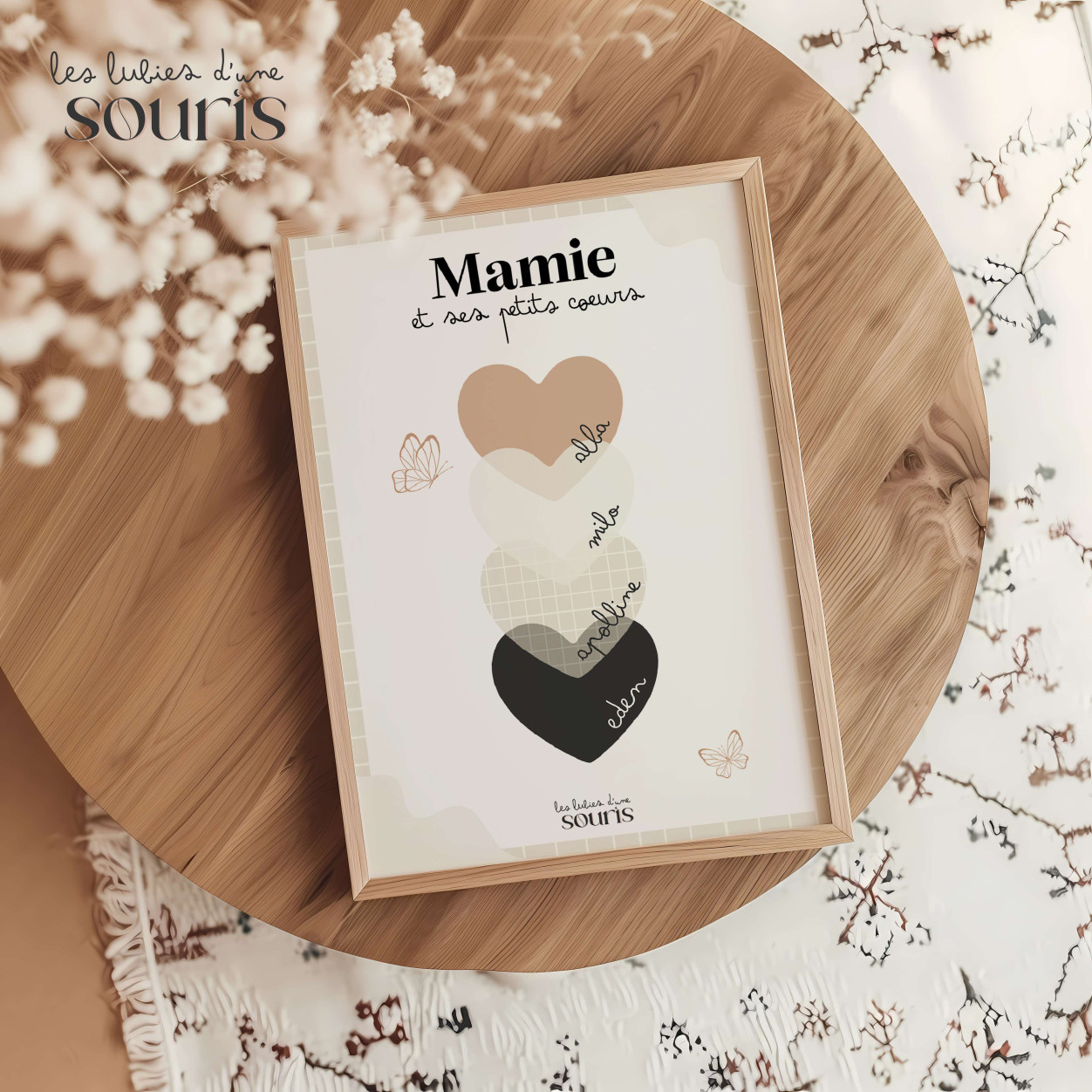 Dans une palette de couleurs nude, douces et intemporelles, cette création délicate met en lumière les prénoms de ses petits-enfants, inscrits avec soin sur de jolis cœurs. Une manière unique et touchante de célébrer le lien précieux qui unit une grand-mère à ses trésors.