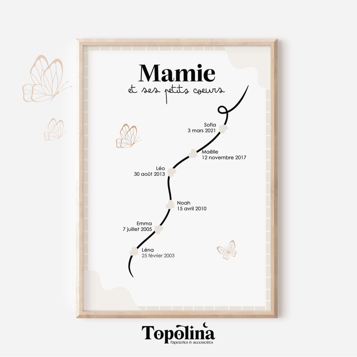 Offrez à votre mamie un souvenir rempli d’amour avec cette affiche personnalisée illustrée d’une ligne conductrice, reliant chacun de ses petits-enfants à son cœur.